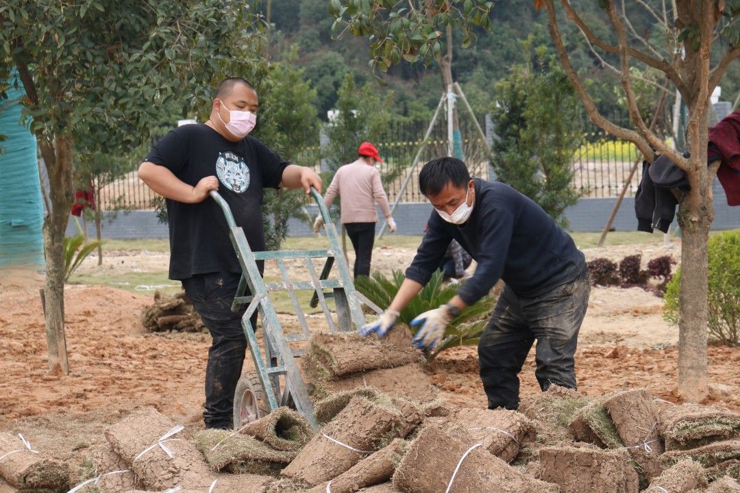 3月16日,在通城縣實(shí)驗(yàn)學(xué)校,記者看到工作人員正在分頭忙碌著,有的運(yùn)送草皮,有的種植樹苗,一派緊張有序、如火如荼的施工場景。